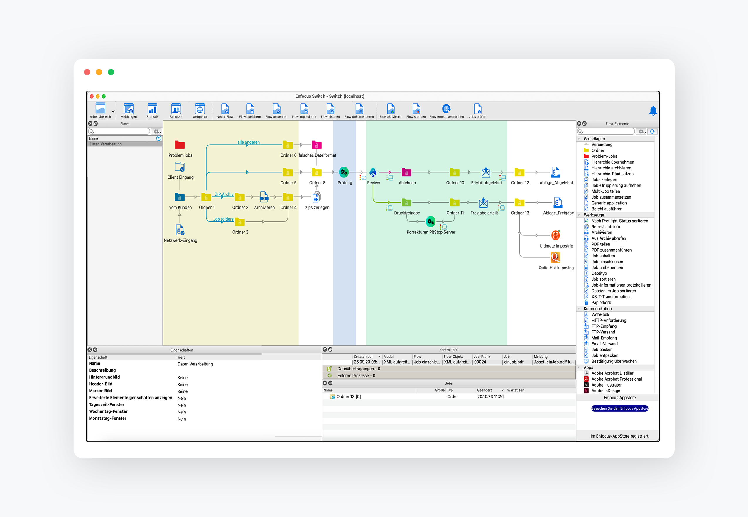 Enfocus Switch ist eine leistungsfähige und äußerst flexible Lösung für die Automatisierung von Produktions-Arbeitsschritten in Agenturen, Verlagen, Druckvorstufen-Betrieben und Druckereien.