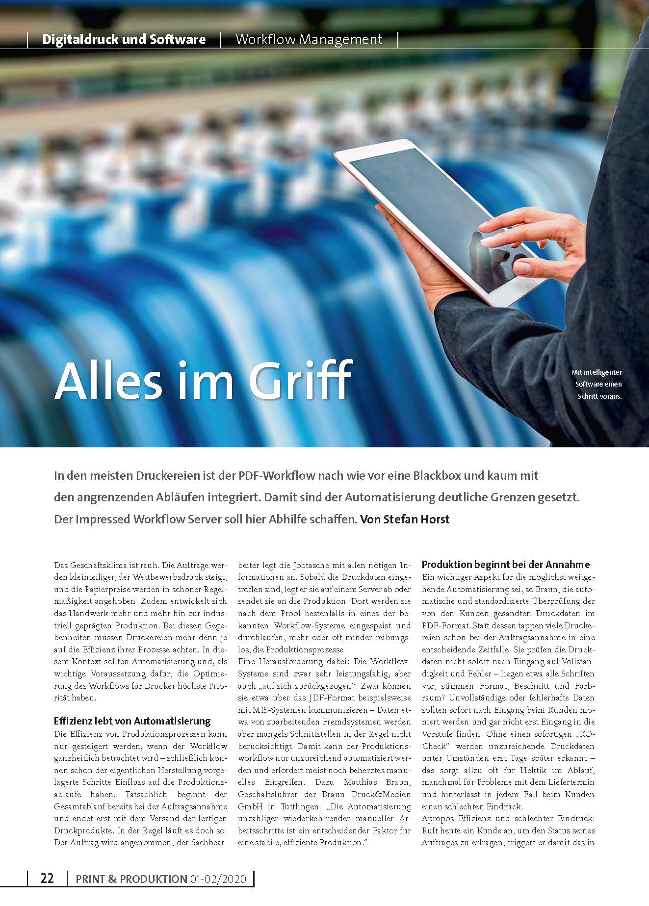 Der Impressed Workflow Server schafft hier Abhilfe. In der PRINT und PRODUKTION 01-02/2020 ist dazu ein interessanter Artikel erschienen: