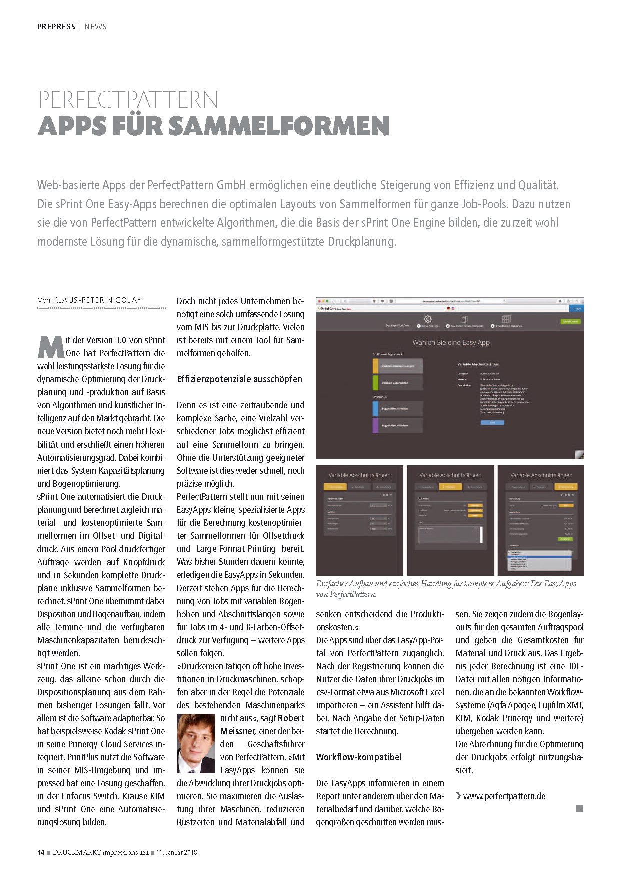 Web-basierte Apps der PerfectPattern GmbH ermöglichen eine deutliche Steigerung von Effizienz und Qualität. Die sPrint One Easy-Apps berechnen die optimalen Layouts von Sammelformen für ganze Job-Pools. Dazu nutzen sie die von PerfectPattern entwickelte Algorithmen, die die Basis der sPrint One Engine bilden, die zurzeit wohl modernste Lösung für die dynamische, sammelformgestützte Druckplanung.