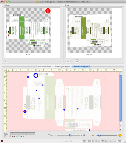 Mit dem neuen Scan-Add-On können Sie Ihre Druckerzeugnisse oder Muster vom Kunden einscannen und digital mit der PDF-Vorlage vergleichen. Mit d'accord lassen sich für die Qualitätssicherung ganze Druckbogen, gestanzte Druckbogen incl. Braille und sogar einzelne, ausgebrochene Nutzen wie beispielsweise Faltschachteln prüfen. Umgekehrt können Sie auch eine neue PDF-Vorlage gegen ein altes freigegebenes Muster testen. Das Scan-Add-On unterstützt handelsübliche Scanner - von A4 bis Grossformat - über die Schnittstelle von Mac OS X.