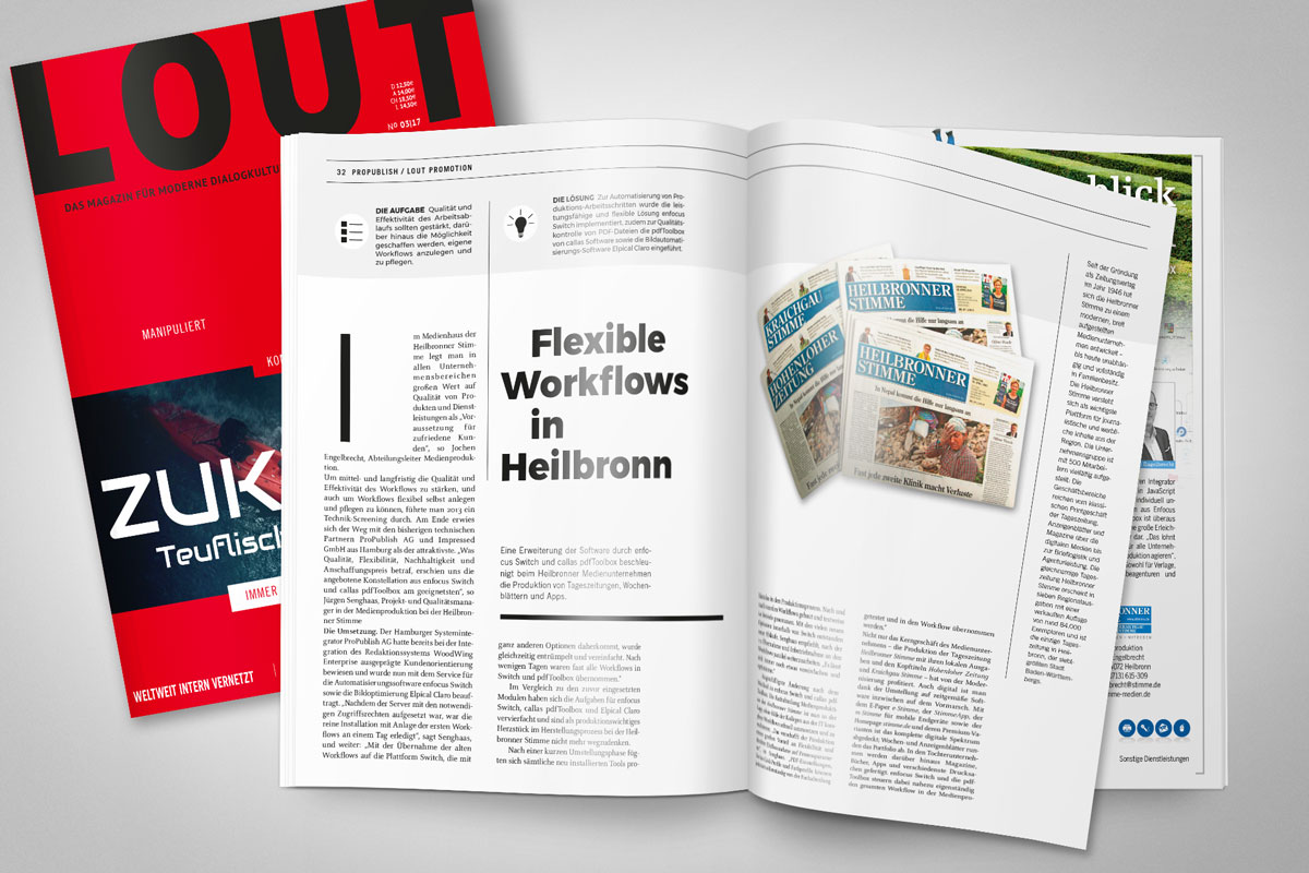Im Zuge der heute beginnenden IFRA World Publishing Expo erscheint der Anwenderbericht im LOUT-Magazin, dem Magazin für moderne Dialogkultur in der Wirtschaft. Da sowohl das Messeprogramm als auch der Themenschwerpunkt der neuen LOUT-Ausgabe No 03/17 zu den Produkten von Enfocus passen, hat man sich dazu entschlossen, in einem redaktionellen Beitrag die „Heilbronner Stimme“ zu Enfocus Switch zu Wort kommen zu lassen. Darin beleuchten Abteilungsleiter Jochen Engelbrecht und Projekt- und Qualitätsmanager Jürgen Senghaas in dem Beitrag „Überblick behalten“ die Vorteile der Automatisierungslösung Enfocus Switch: