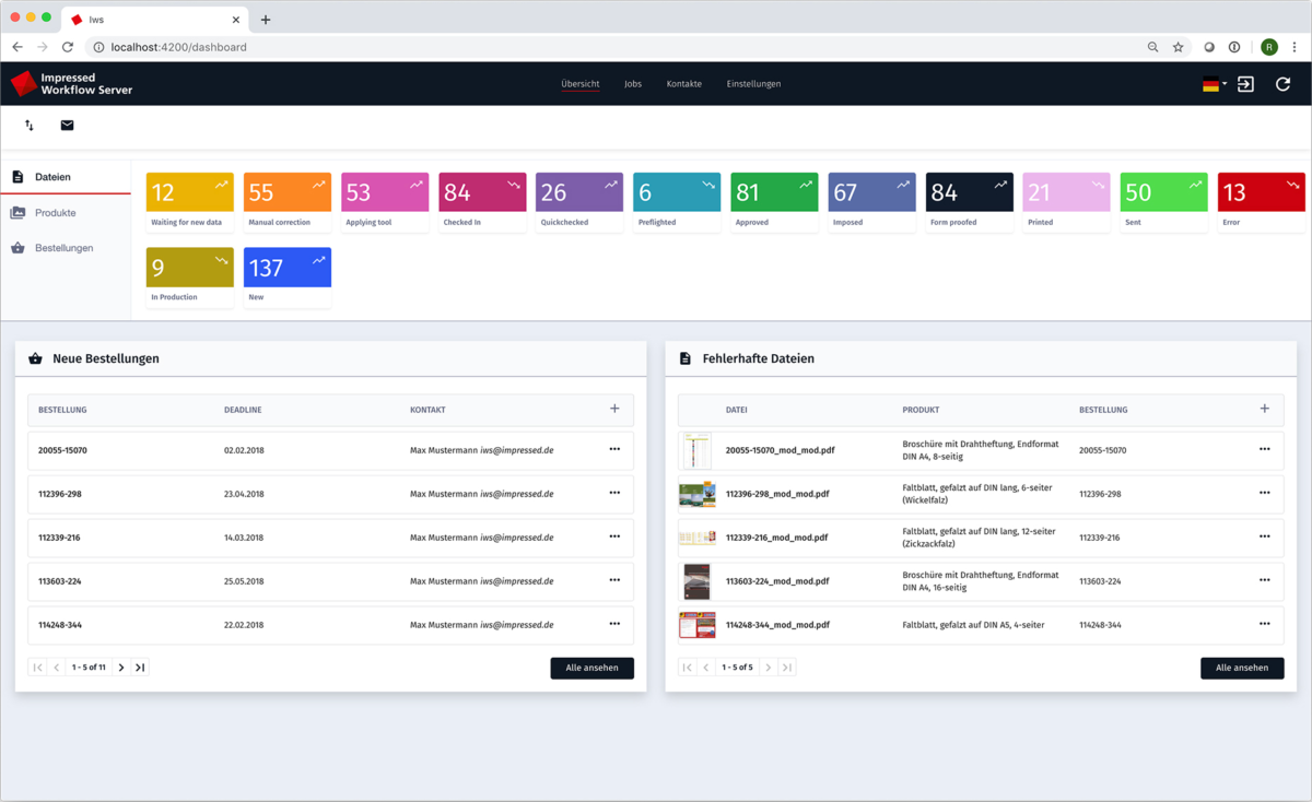 Der Impressed Workflow Server (IWS) dient dem Management des PDF-Workflows in der Druckproduktion. Er ermöglicht, zeitintensive und fehlerträchtige manuelle Prozessschritte zu standardisieren und zu automatisieren. So werden die Effizienz und die Sicherheit der Produktionsprozesse optimiert – der Durchsatz wird gesteigert, die Qualität von Dienstleistung und Produkt wird verbessert.