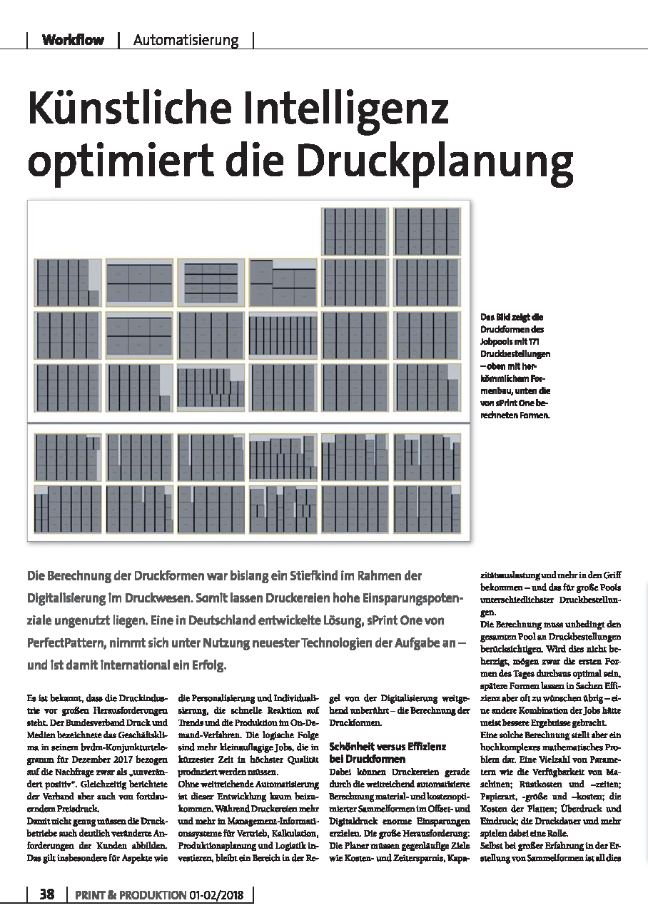 Die in Deutschland entwickelte Lösung sPrint One von Perfect Pattern geht hier konsequent einen neuen Weg. Unter Nutzung modernster Technologien und Algorythmen berechnet es Druckformen über den gesamten Auftragspool in Sekundenschnelle unter Berücksichtigung einer Vielzahl von Kriterien wie die Maschinenverfügbarkeit und -Performance, Rüstkosten und -zeiten, Papier-Art, -Größe und -Kosten, Platten-Kosten....