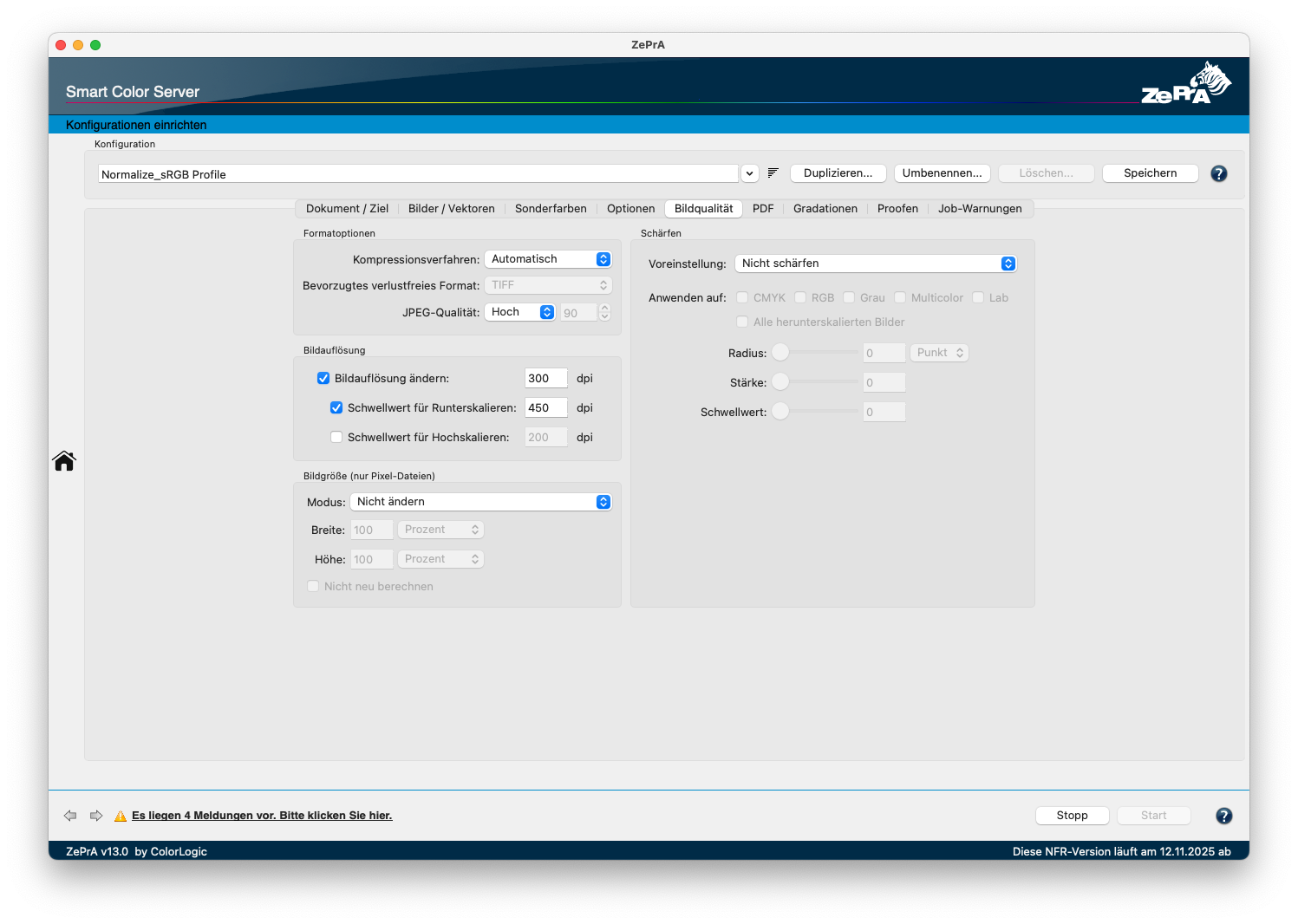 einheitliche Bildauflösung und eine bestimmte Komprimierungsstufe gebracht werden, welche für die weitere Verarbeitung bzw. den Druck der Datei sinnvoll sind.