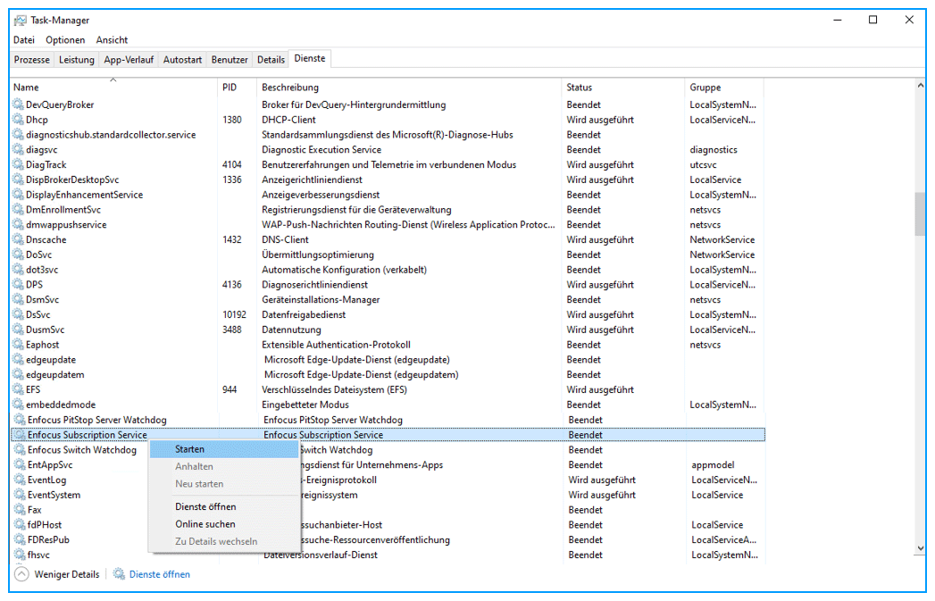 Öffnen Sie dazu bitte den Windows Task-Manager und beenden, falls vorhanden, EnfocusSubscriptionNotifier.exe und EnfocusSubscriptionService.