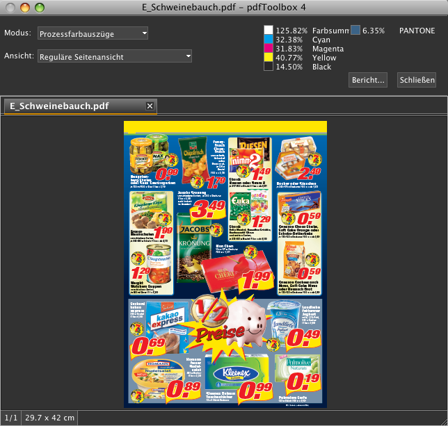 Wenn Schmuckfarben enthalten sich, so zeigt pdfToolbox Desktop auch die Flächendeckungssumme der Sonderfarbkanäle an. Wählen Sie dazu im Popup-Menü Ansicht/Reguläre Seitenansicht.
